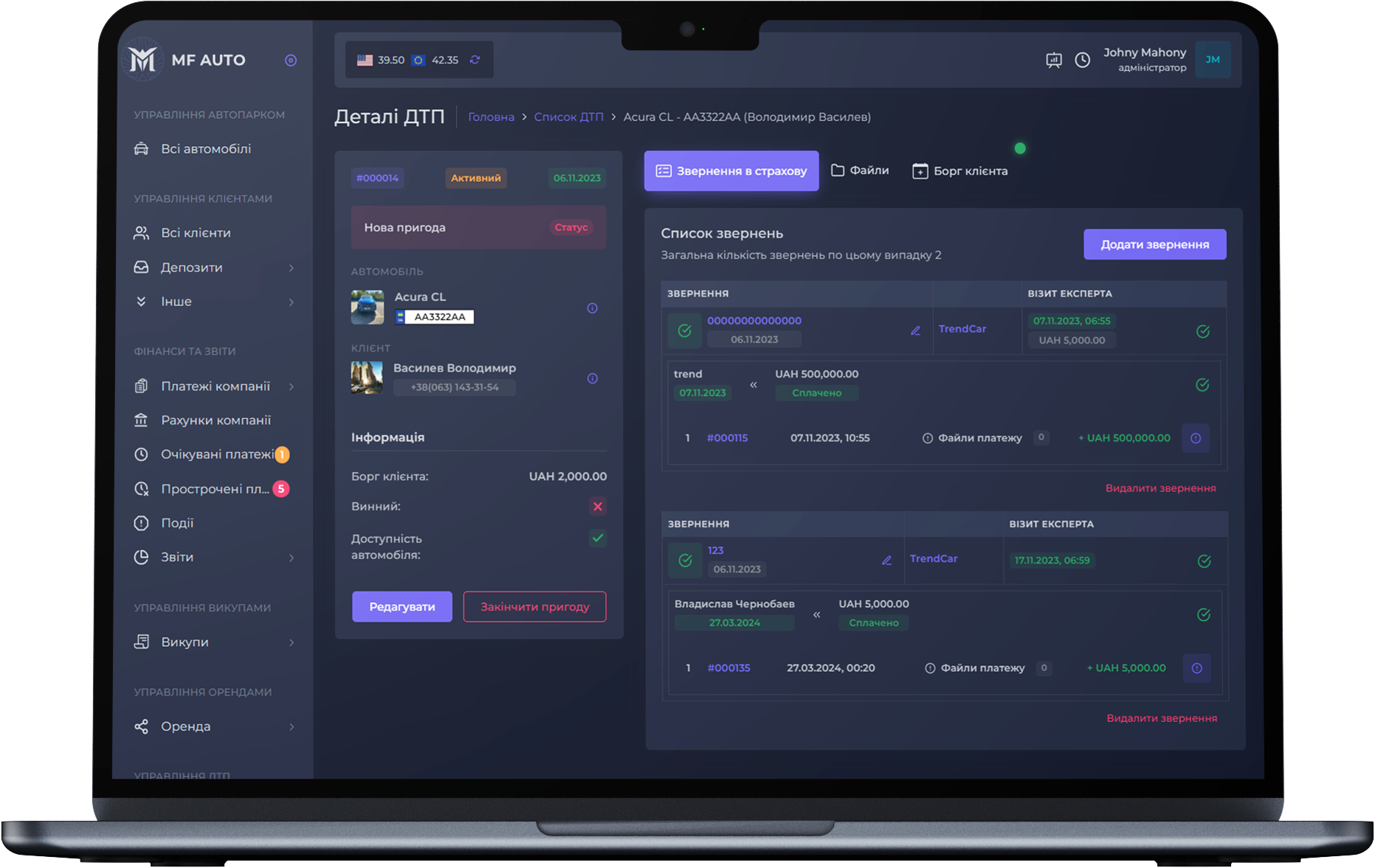 This is a comprehensive solution integrated into the rental, buyout, and accident modules, allowing for financial records related to the client.